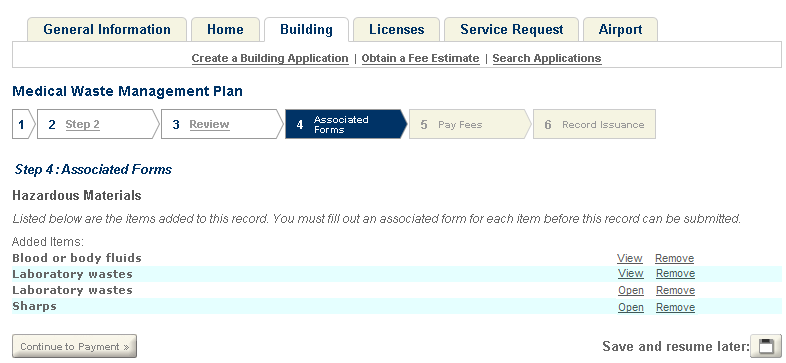 In the Associated Forms step, users must complete creation of all child records before moving forward to the next step, Pay Fees.