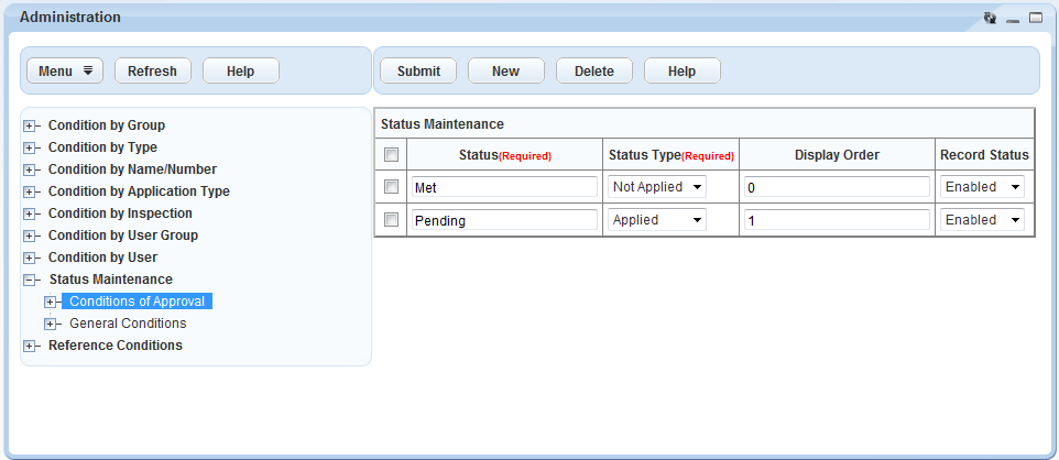 Expand Status maintenance from the navigation tree and then select Conditions of approval or General conditions.