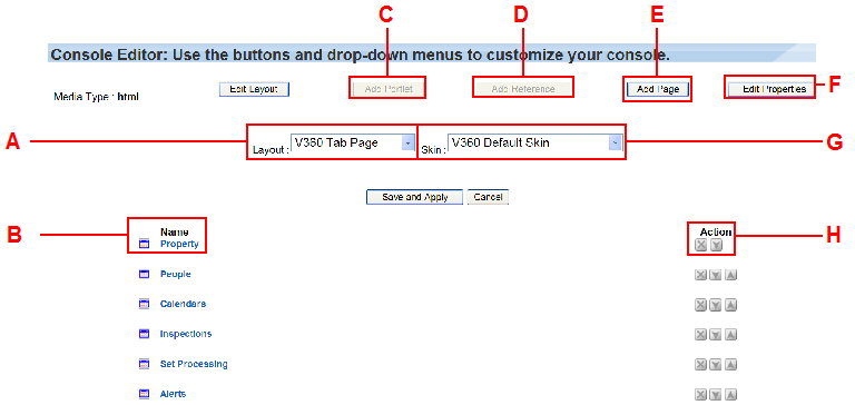 | A | Layout. The console layout menu. Use this drop-down menu to modify portlet layouts. |