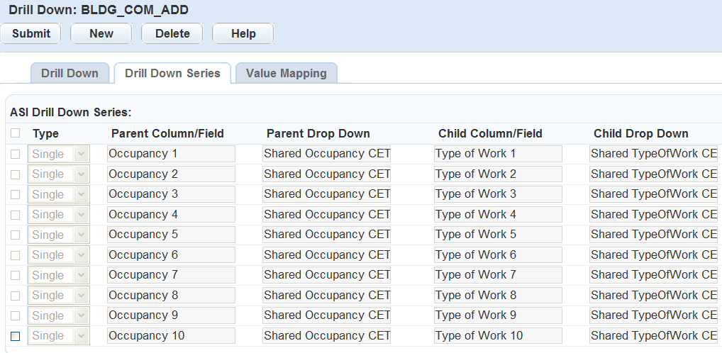To create additional drill-down levels, repeat sub-steps a - c above. Civic Platform automatically identifies the parent custom fields drill-down type and shared drop-down list as the Child from the previous level. Specify the relevant custom lists subgroup in the Child Column and Child Drop Down for the new level.