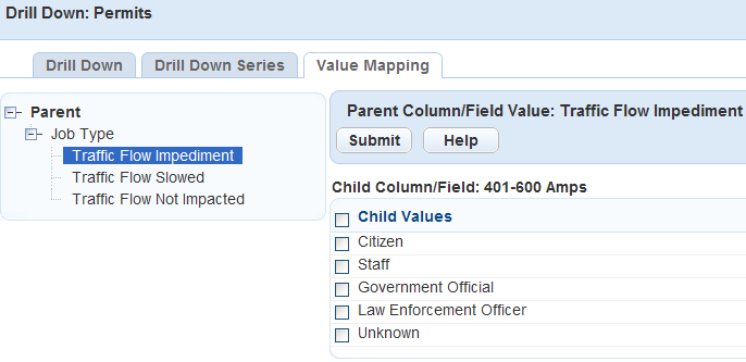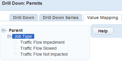 The Value Mapping tab for a drill-down enables the data values in the Child column/field to be mapped to the Parent column/field data values. The Value mapping tab for a custom list drill-down enables the data values in the Child column/field to be mapped to the Parent column/field data values. You define the data values with shared drop-down lists. The nodes in this level depend on your selections in the Drill down series tab. When you create the drill-down field or the drill-down table, all of the values from the shared drop-down list display in the Value mapping tab, which enables you to use duplicate child values for multiple parent criteria.