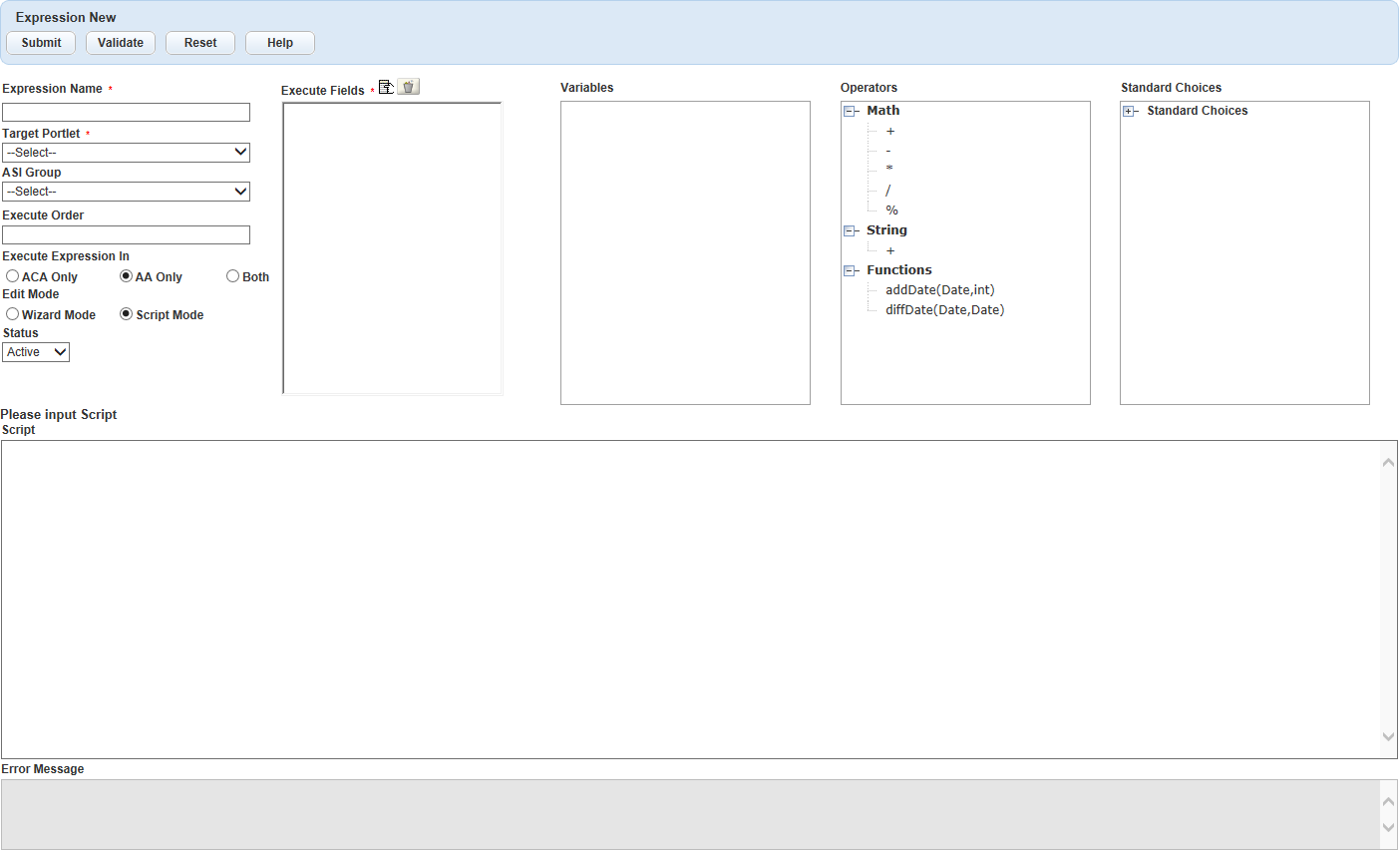 For information on building expressions using script mode, see the Accela Civic Platform Scripting Guide.