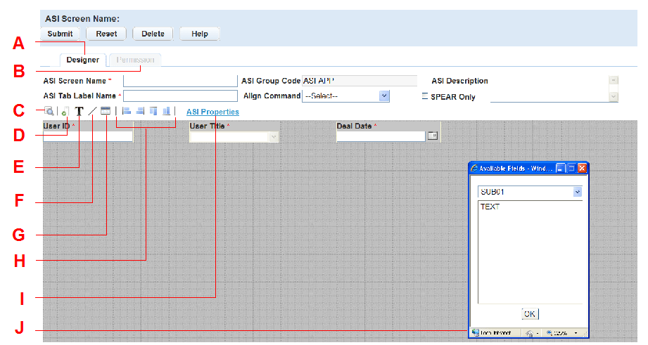 # Description A Use the Designer tab to create and design the form. B Use the Permission tab to assign permissions and make forms available to users. C Use Preview to see your changes before saving. D Use Available fields to view the available fields to add to this page. Double-click the name of the field to add it to the form. E Use Add label to add text to the page. F Use Add line to add a line to the page. G Use Add custom lists or attributes to add the table associated with a Custom fields group code or an Asset template ID to the form. This button is only available in the Custom fields form layout editor and the Asset form layout editor. H Use the alignment buttons to align the fields left, right, top, or bottom. To align multiple fields, hold the Ctrl key, select each field you want to move, then select an option from the menu. These function exactly like the Align command menu options. I Custom fields properties. This opens a respective configuration area in Civic Platform. The fields available pertain to the attribute template for the APO Type, the Custom Fields subgroups, or the Workflow subgroups. If you need to add a field to available fields list, you must first add it to the respective area: the attribute template, the Custom Fields subgroups, or the Workflow subgroups. J The available fields window. This window displays all available fields for the APO Type, Custom Fields Group Code, Asset Template ID, and TSI Group Code. Double-click the field name to add it to the form. -