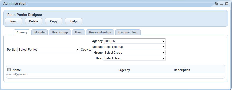 Select one of the following tabs depending on the level of form you want to create: Agency, Module, User group, User, Personalization, or Dynamic text. We are using the Module tab to illustrate this example. Depending on the level (agency, module, user group, or user) of the design you create, you might not see all of these fields.