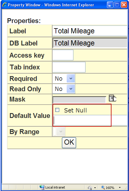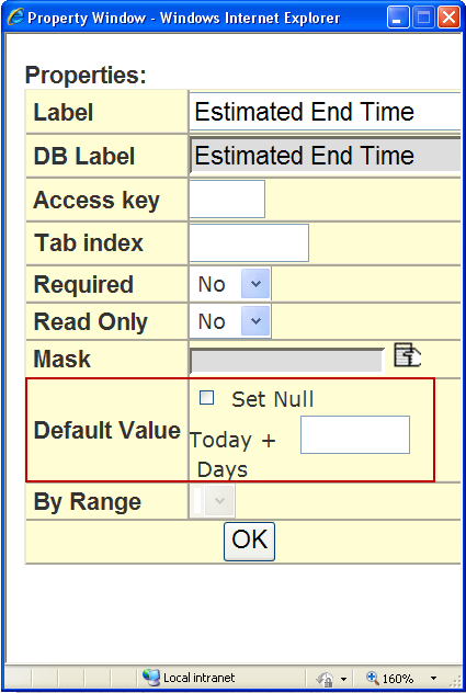 The default value varies depending on the By range field property. When you set the By range field property to Yes, Civic Platform displays the Default from and Default to properties instead of the Default value property. When you set it to No, Civic Platform displays the Default value property only.