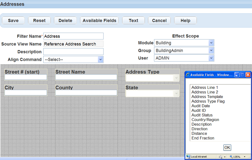 Note: The Available fields list also provides the address template, parcel template, or owner template options. If you select any of those options, Civic Platform removes the option from the list and displays all active attributes of the selected template as additional fields on the form. The APO form layout editor defines the layout and display of each field in a template.