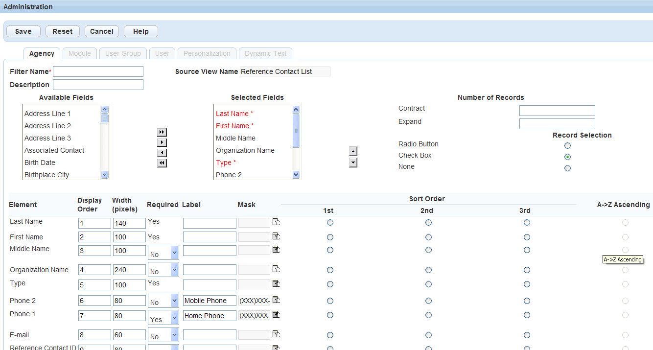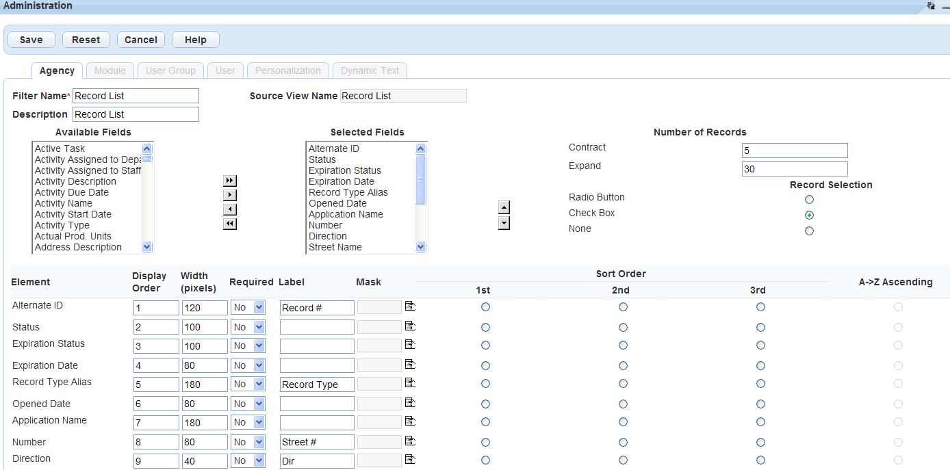 | Record selection | Select the type of record selection icon you want to apply to the list. Civic Platform defaults to the Check Box record selection tool. If you do not want to allow users to select records, select None. |
