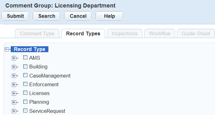 Use the + and - buttons to expand and collapse the tree to find the record type, checklist, inspection, or workflow to which you want to assign the comment group.