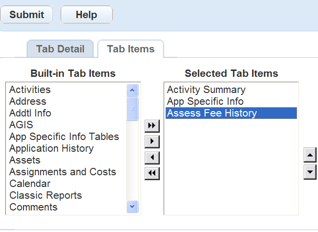 From the Built-in tab items list, select and highlight the tab item you want to add and select the right Single Arrow