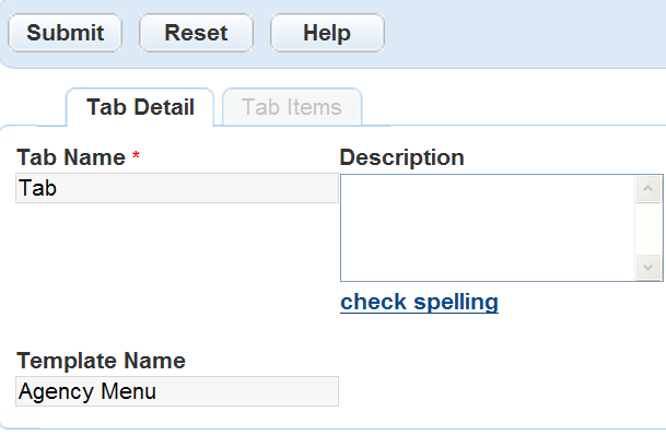 Field Action Description Enter a description for the tab menu. Tab Name This read-only field displays “Tab,” the default name reserved for tabs. Template Name This read-only field displays the template name. -