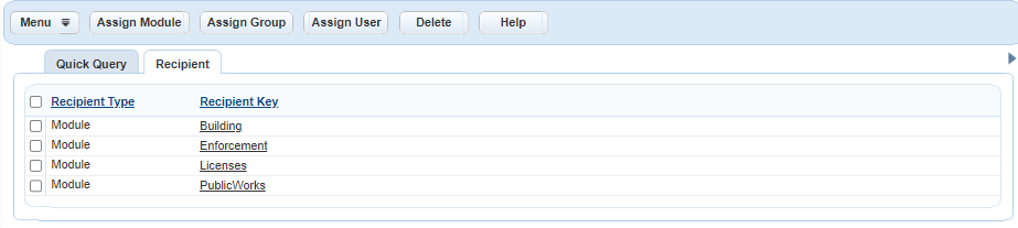 Note: You can remove a model, group or user by selecting the check box(es) next to the module(s), group(s), or user(s) displayed in the Recipient tab and select Delete.