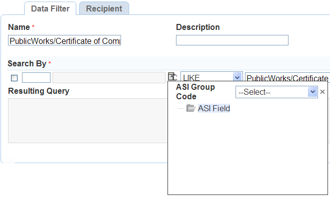 Custom fields - Civic Platform displays all the groups. Select a Custom fields group code, then select the desired field in the Custom field navigation tree to specify the custom field to filter.