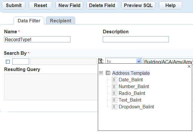 Address template, Parcel template, or Owner template - Civic Platform displays all of the active template attributes. Select the desired attribute to specify the field to filter.