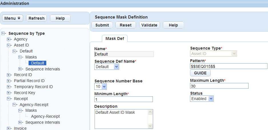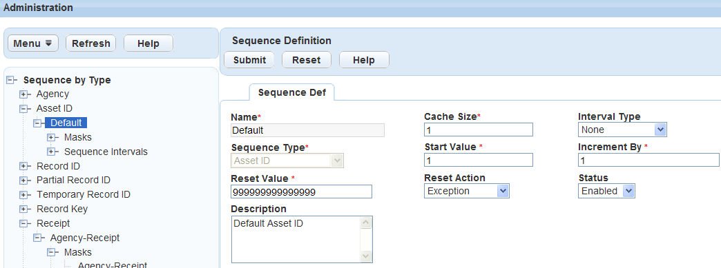 The Default Mask Pattern for the Asset ID is $$SEQ015$$ with a base of 10. The Sequence Interval Type is equal to None and the Sequence Name is “N” which means it never resets based upon a date. |