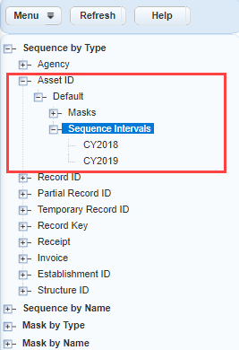 Expand the Sequence type in the navigation tree. For example, Agency > Batch invoice, or Asset ID > Default.