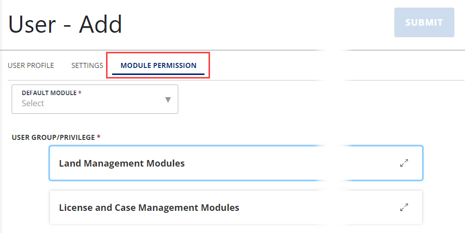 After entering the new user profile information, select the Module permission tab.