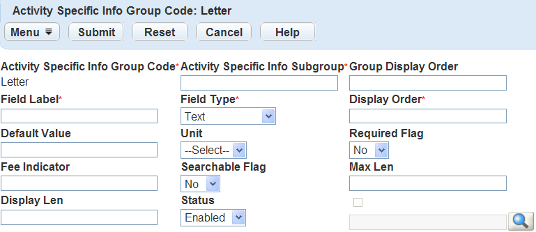 Display len Specify the maximum number of characters that the activity-specific information can display. Max len Specify the maximum number of characters that the field accepts. Searchable flag To allow users to search for the activity-specific information, choose Yes; otherwise, choose No. Status To allow users to use the activity-specific information field, select Enabled; otherwise, select Disabled. Required flag To require users to enter a value in this field, choose Yes; otherwise, choose No. If you are adding a drop-down list field, you must set the values that you want to include in the list of the field. For more information, see Set drop-down list field values in a subgroup. -