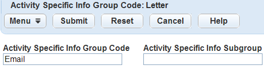 Default value Enter the desired default value for the activity-specific information group code. Activity specific info group code Enter the name of the activity specific group. Activity specific info subgroup Enter the name of the activity specific subgroup.