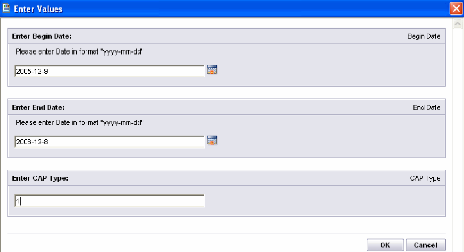 Editing a report parameter can affect if and how the report parameter displays in the Accela parameter prompt window. For example, when you change the visibility of a parameter to NO, the parameter no longer displays. If the report has required parameters, the user receives the parameter prompt window supplied by the reporting service. The parameter prompt window also displays if you do not properly enter the parameter name. This type of change can be confusing to the user and requires another step before a user can run the report.