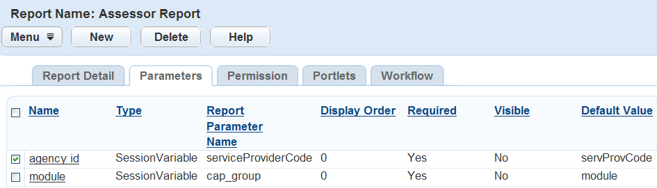 Set the visibility to no for any additional parameters that do not need to display in the parameter prompt window, such as an Accela-provided parameters. If the report has required parameters the user does not supply, the reporting service prompts for this value before running the report.