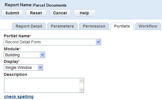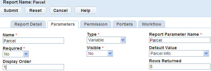 Field name Field description Name Enter the name of the report. The name you enter displays in the Report page or portlet-specific report menu. If this is a permit print report, enter Permit print. Category Select the category the report belongs to. Report service Use the menu to select the URL_Report report service. Report link Enter the URL to the report source. For example, enter http://permit.accela.com. To pass static parameters, include them in the URL address. For example, enter http://permit.accela.com/PERMITID07BBP-00000-0010. To pass Accela-provided parameters, you must add parameters in the Parameters portlet. You might also need to accommodate the end of the URL to accept the parameter with /index.jsp so that the parameter value matches the following example: http://permit.accela.com/index.jsp/permitID=07BBP-00000-0010. For instructions on adding parameters, see .