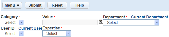 Field Action Category Select the category from the drop-down list. SR Type is the only category currently available. Value select the Selection icon to select a value from the display. Department Select the department where you want to assign the skillset. User ID If you are creating a skillset for an individual user, use the drop-down to select the user ID of the staff member that belongs to the department you selected. Expertise Select the level of expertise the person has in the skills. Civic Platform assigns the skillset points for the skillset to workload ratio based on this selection.