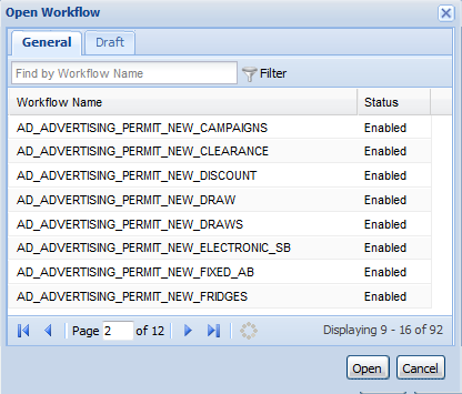 | Open | Display all the existing workflows (in the General tab) and draft workflows (in the Draft tab). |