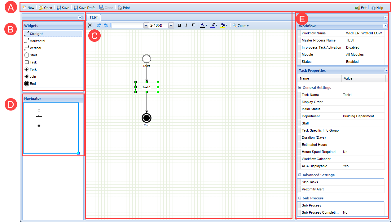 | A | Workflow Designer Menu | Contains the New, Open, Save, Save Draft, Clone, Print, Exit, and Help buttons. |