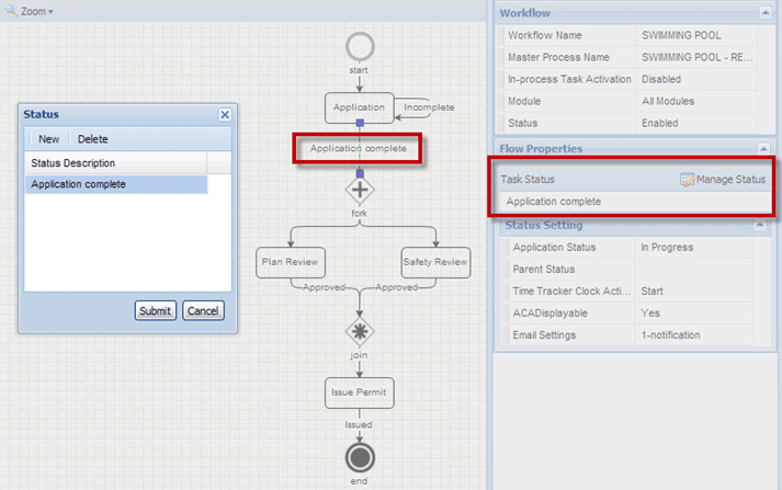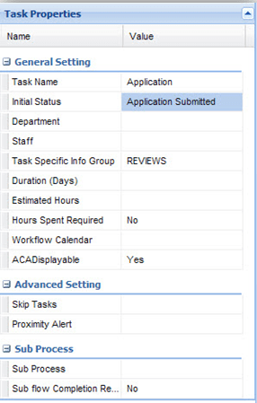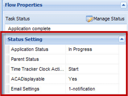 Property Description Task status Displays the status that a task must reach before the activation of its next task. With multiple statuses, a task only needs to reach one of the statuses before the activation of the next task. Application status Enter a status. If the task that the flow widget starts from reaches the Task Status, the Application Status entered in this field displays as the Application Status. Parent status This field works with the flow widget that starts from a sub-process task. Enter a status in this field. If the sub-process task reaches the Task Status, the parent task that contain the sub-process changes to the status in this field. Time tracker clock action Select the time tracker clock action that triggers when the task reaches the selected status. The time tracker clock controls how the Time Tracker records In Possession time for workflow tasks and for applications. Citizen Access displayable To display the task in Citizen Access, select Yes. Otherwise, select No. Email settings Displays the number of notifications to send when the task reaches the selected status. 0-notification means there is no notification, 1-notification means Civic Platform sends one notification, and so forth. Selecting the field entry area pops up an Email Settings window. Create, edit, or remove the notifications.