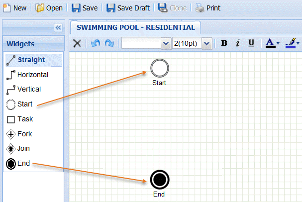 From the Widgets panel, drag and drop a Start node and an End node onto the blank workspace. Leave space between the nodes to enter details later. For descriptions of the widgets, see the Widgets panel section below..