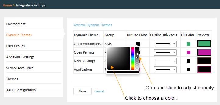 - To customize the fill color and opacity for a specific dynamic theme, click its Fill Color icon using the color picker and opacity slider widgets.