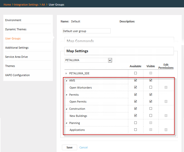 - To make the dynamic theme visible by default to the user group, mark the Visible checkbox for that dynamic theme layer. If a dynamic theme is marked as visible, and the dynamic theme appears on the Layers widget by default. An end-user can choose to hide it.