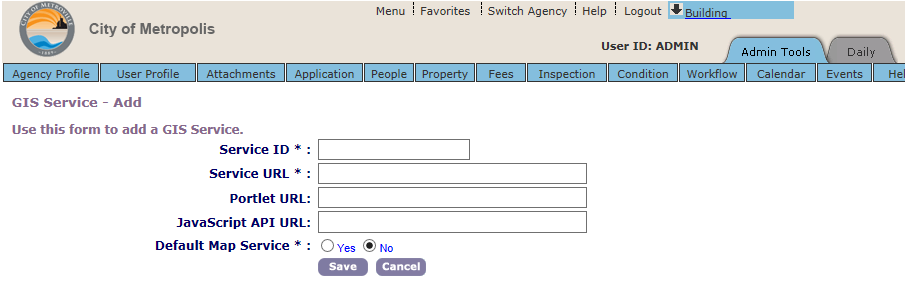 | Default Map Service | Select Yes if you want this map service to be the default map service in Accela GIS. The default map service displays at the top of the GIS service drop-down list for GIS users. |