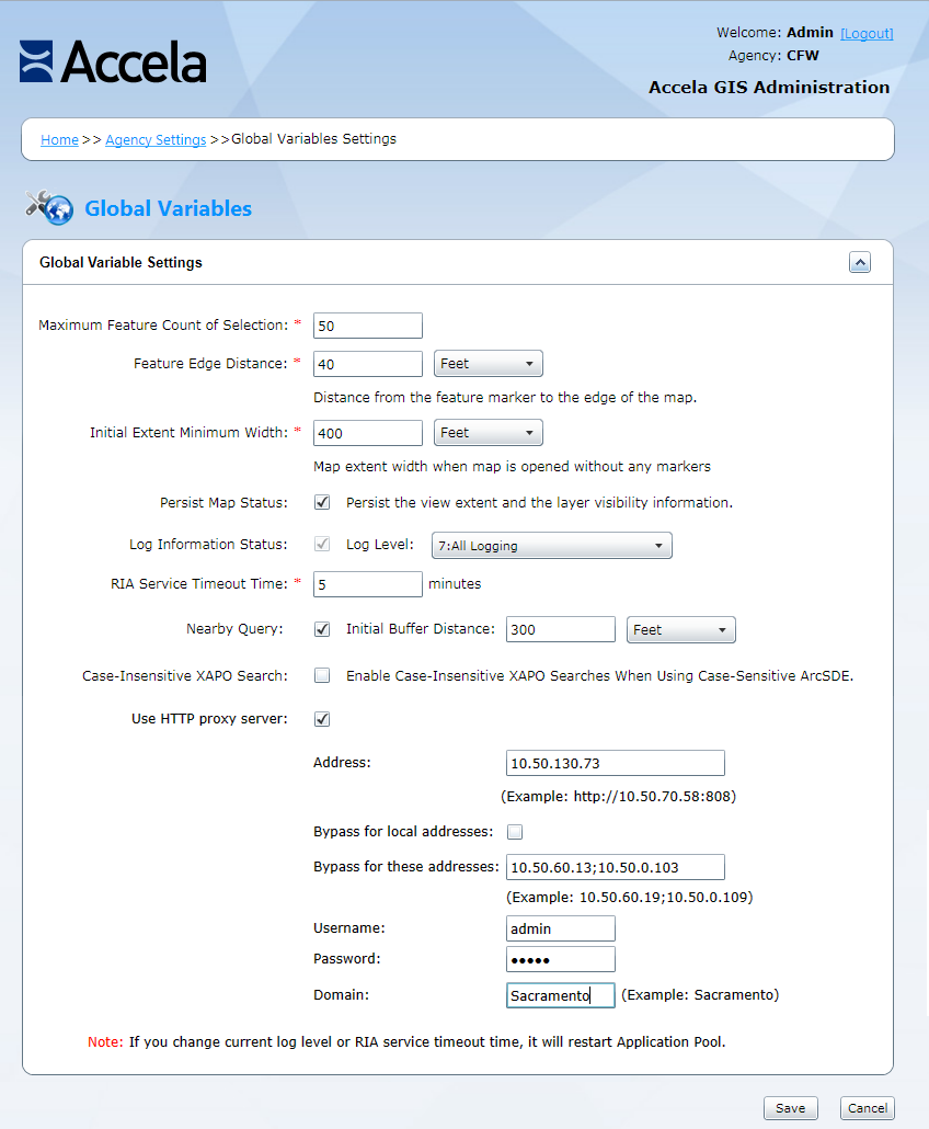 The Accela Silverlight GIS Administration site displays the Global Variable Settings page.