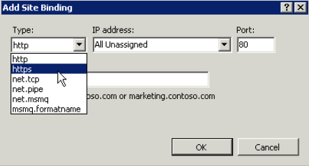 Type Select “https” from this drop-down list. Then IIS Manager refreshes and displays the Add Site Binding dialog box as follows: IP addresses Select “All Unassigned” from this drop-down list. Port Enter any desired port number. By default, it is 443. SSL certificate Select the SSL certificate that you have obtained and installed from the certificate authority. -