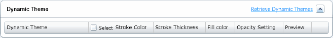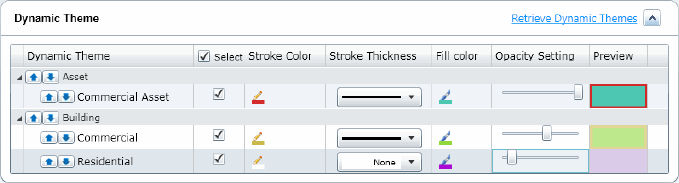 You can retrieve dynamic themes from the Civic Platform application server, select dynamic themes that belong to a map service, and define dynamic theme symbology in the Dynamic Themes section.