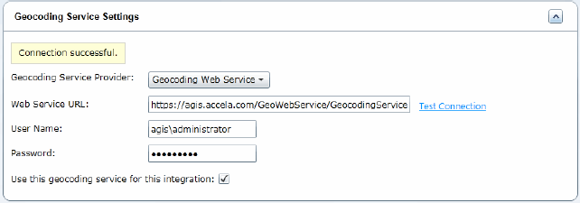 Web Service URL Enter the URL of a custom geocoding web service. User Name Optionally, enter your user name along with the password for connecting to the geocoding web service. Password Optionally, enter your password along with the user name for connecting to the geocoding web service. Using this geocoding service for this integration Mark this check box if you want the geocoding web service to be the default geocoding service in your map integration environment. Otherwise, clear this check box. -