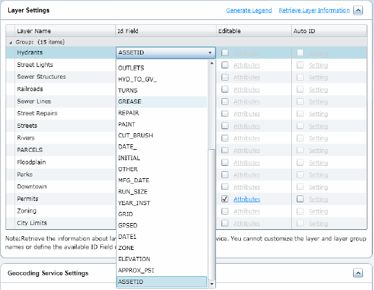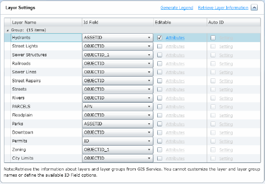 Layer Name Layer groups and names are automatically retrieved when you select a map service. By default, this column is expanded and displays all the layer groups and names. ID Field This drop-down list displays the available attribute fields for the selected map layer. Select an identification field for each map layer. Editable Mark the check box next to the map layer that you want to make editable, then click the Attributes link to configure which attributes are editable.