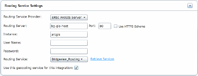 Optionally, if you plan to use routing in your map integration environment, you can use the Routing Service Settings section to retrieve a routing service.