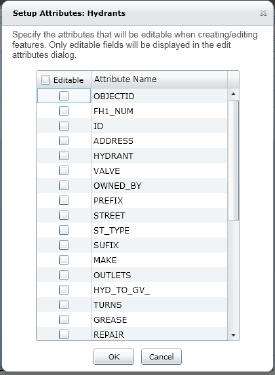For example, you might configure a fire hydrant map layer for editing, and then determine which related hydrant attributes are editable, such as the hydrant’s address, manufacturing date, model, and owner.
