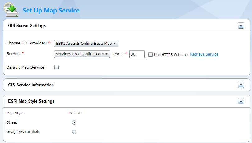 Street Map this option if you want the default map display to be Esri’s world street map. This is the default map service display. ImageryWithLabels Mark this option if you want the default map display to be Esri’s Imagery map.