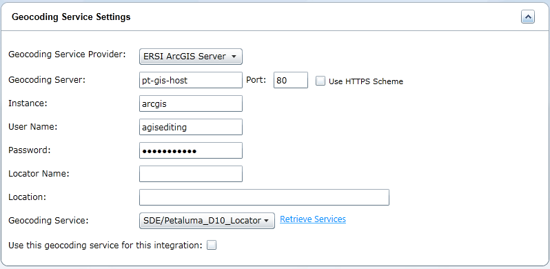 Geocoding Service When you click the Retrieve Services link, this drop-down list populates with the all the geocoding services set up on your geocoding server. If you select ArcGIS Online as the geocoding server, this drop-down list populates with the ArcGIS Online geocoding services such as World. Use this geocoding service for integration Mark this check box if you want the selected geocoding service to be the default geocoding service in your map integration environment.
