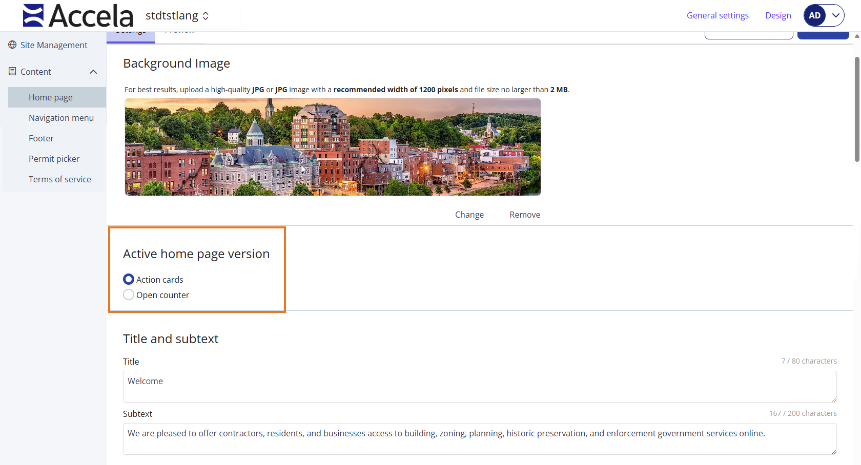 Select the check box in the Show on home page column. This will move the action card to the Shown on home page section.