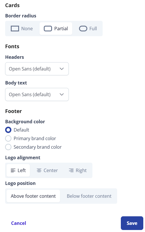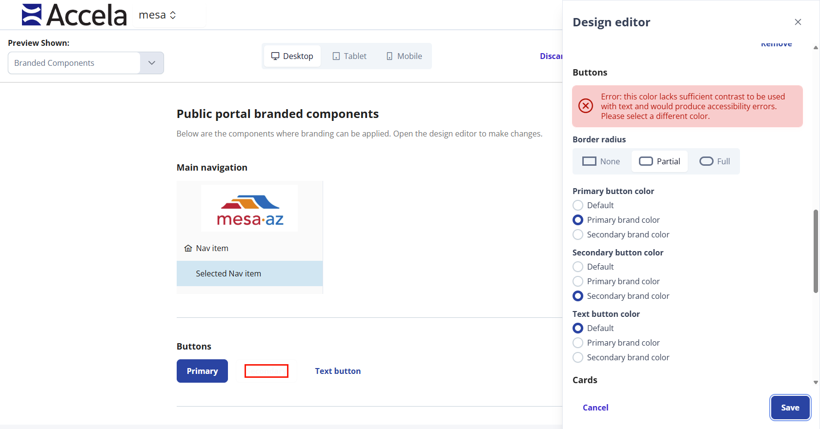 Note: The design editor has built-in safeguards to guarantee your colors stay within accessibility and compliance. You will receive a warning if you select a font and background color that are inaccessible.