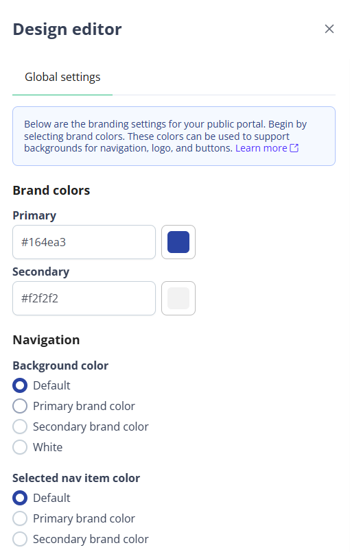 Primary The primary color for your brand that displays on your user-facing Public Portal.