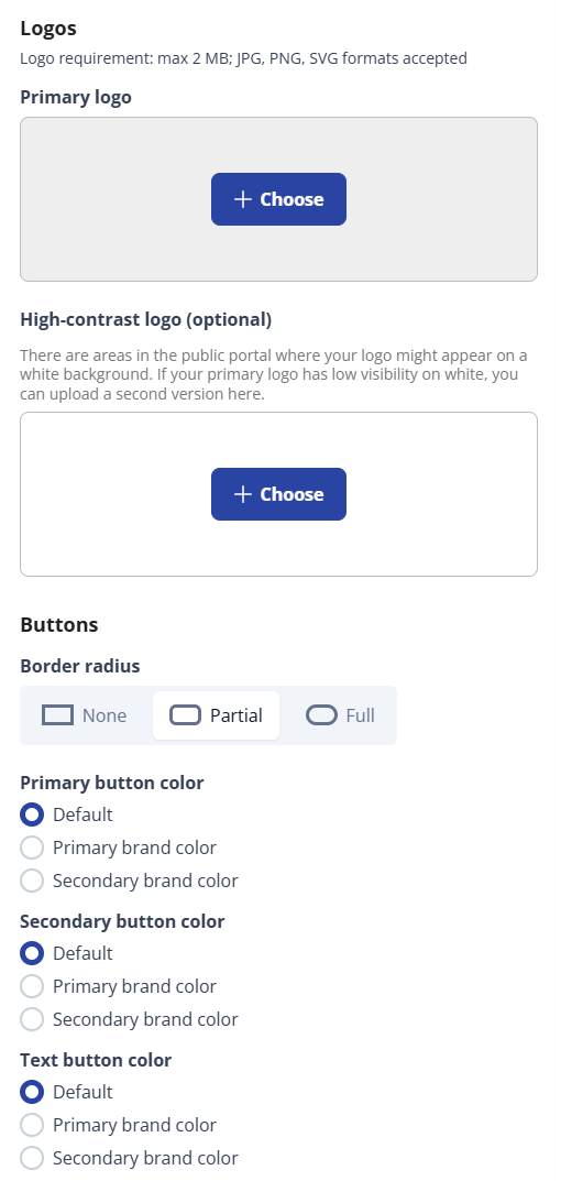Tip: Your logo should not exceed 2 MB. Acceptable formats include JPG, PNG, and SVG.(Optional) High-contrast logo This is an optional logo. This logo is used in some parts of the Public Portal when the logo needs to be compressed or displayed with a greater resolution.