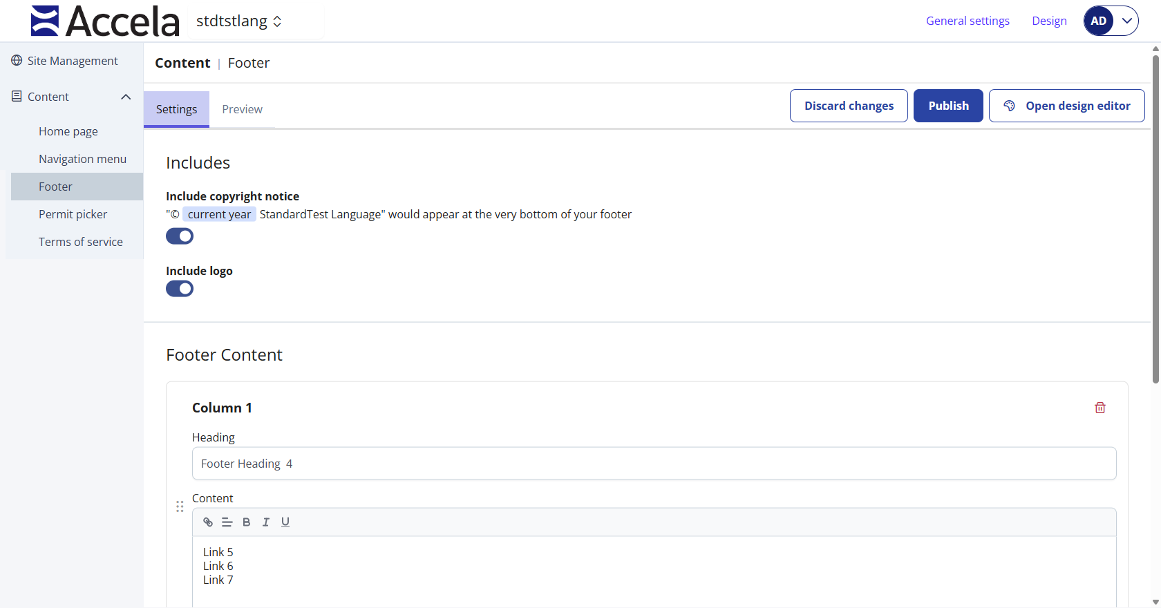 You can have up to four columns in the footer, as well as an image and a copyright notice. Use the Design editor to configure the organization of your public user home page footer. See Footer design editor for more information.