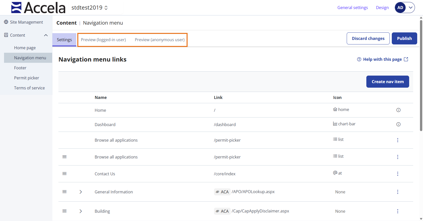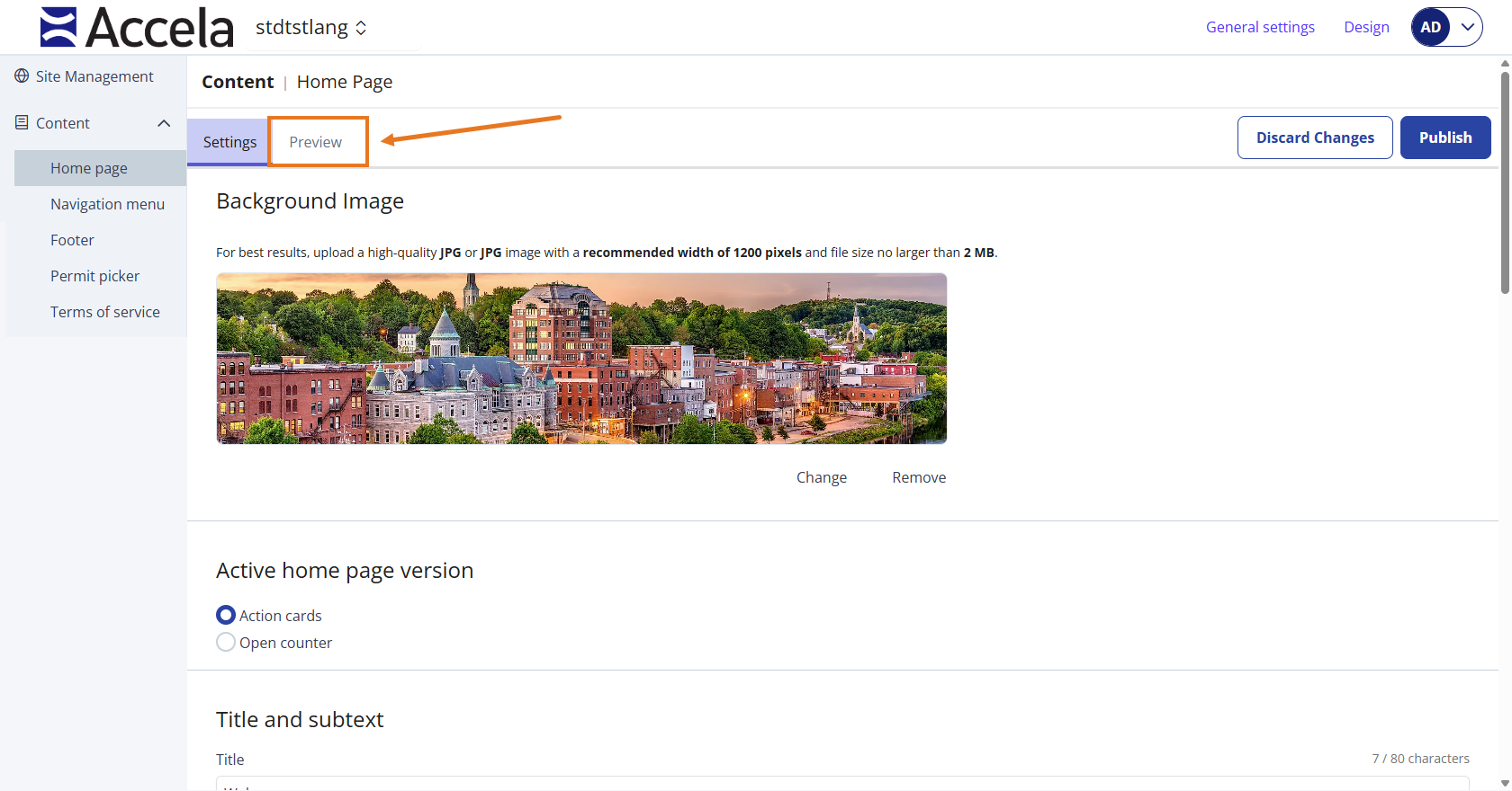 As you configure the user home page and navigation, you can preview the user home page to help you visualize changes before they go live.