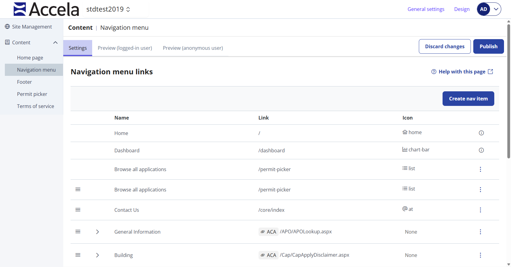 The navigation menu is the vertical menu on the left side of the Public Portal user page. It provides links for public users to navigate different sections of the portal. By default, it includes items like Home, Dashboard (if user is logged in), and any modules your agency has, such as Building, Planning, Licenses. You can add navigation links to point to external resources or additional pages, and you can reorganize the menu structure.