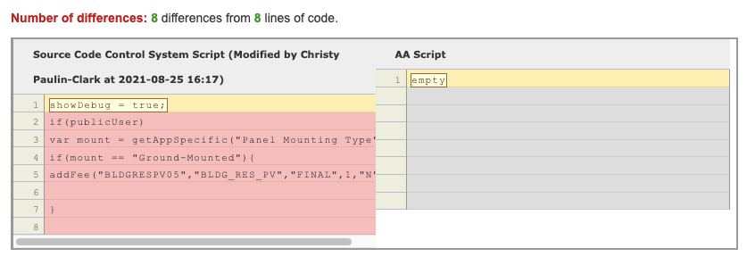 Note: You can also hover your mouse over the script name and right-click the script name and select Diff to open the differences window.The script in the repository will display in the window to the right on the left side. The script in the Civic Platform will display in the window to the right on the right side.
